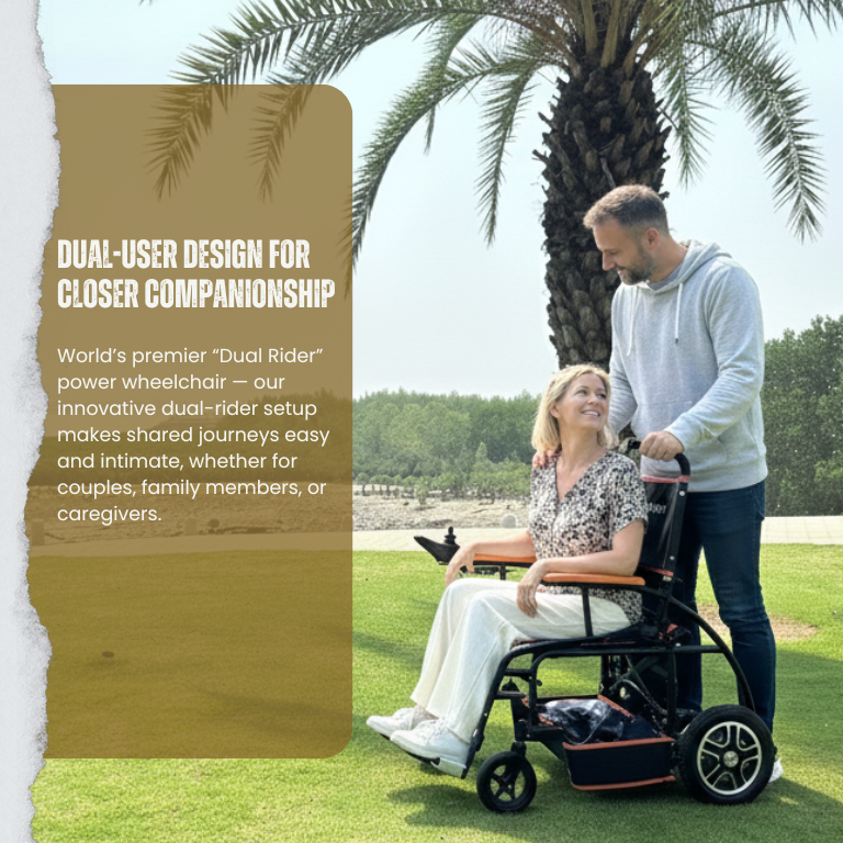 JoyErider — 's werelds eerste dual power rolstoel, gemaakt voor gezamenlijke belevenissen. Een elektrische rolstoel die samen reizen gemakkelijk maakt. Voor koppels, familieleden of verzorgers.
