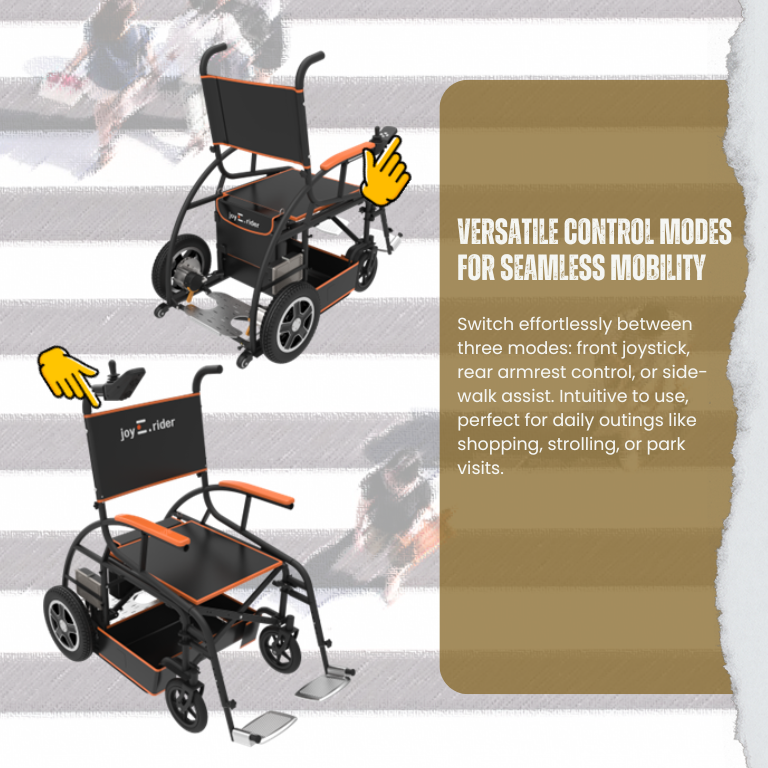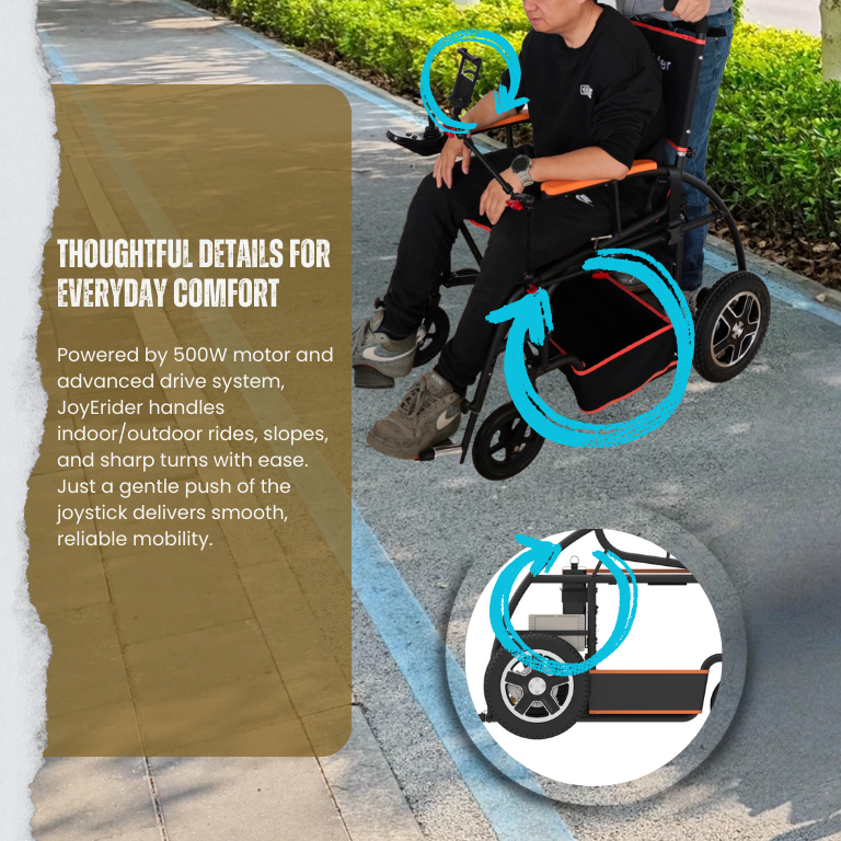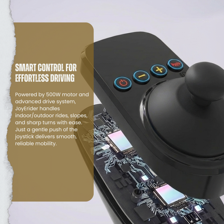Schakel moeiteloos tussen drie modi: joystick vooraan, armsteunbediening achter of zijwaartse loophulp. Intuïtief in gebruik, perfect voor dagelijkse uitstapjes zoals winkelen, wandelen of parkbezoeken. Aangedreven door een 500W-motor en een geavanceerd aandrijfsysteem, kan JoyErider met gemak ritten binnen/buiten, hellingen en scherpe bochten aan. Slechts een zachte duw van de joystick zorgt voorbetrouwbare mobiliteit.