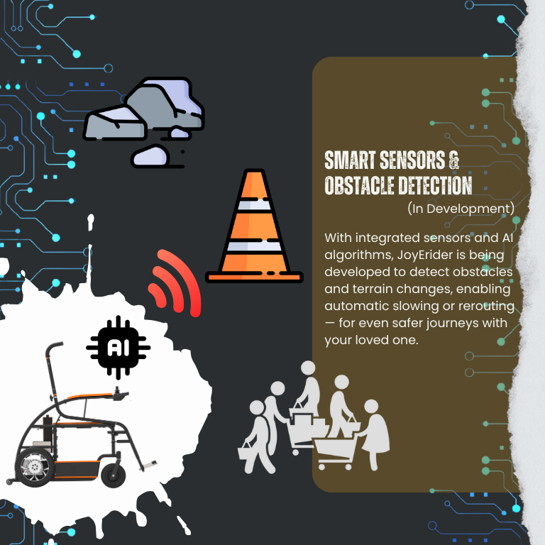Elektromagnetische remmen, balansregeling en noodstopfuncties houden elke rit veilig. Van rustige buurten tot drukke straten, JoyErider zorgt voor stabiliteit en gemoedsrust. De ruime mand onder de stoel bewaart gemakkelijk tassen en benodigdheden. Het Quick-release batterijsysteem zorgt voor naadloos opladen. Met geïntegreerde sensoren en AI-algoritmen wordt JoyErider ontwikkeld om obstakels en terreinveranderingen te detecteren, waardoor automatische vertraging mogelijk is - voor een nog veiligere reis.